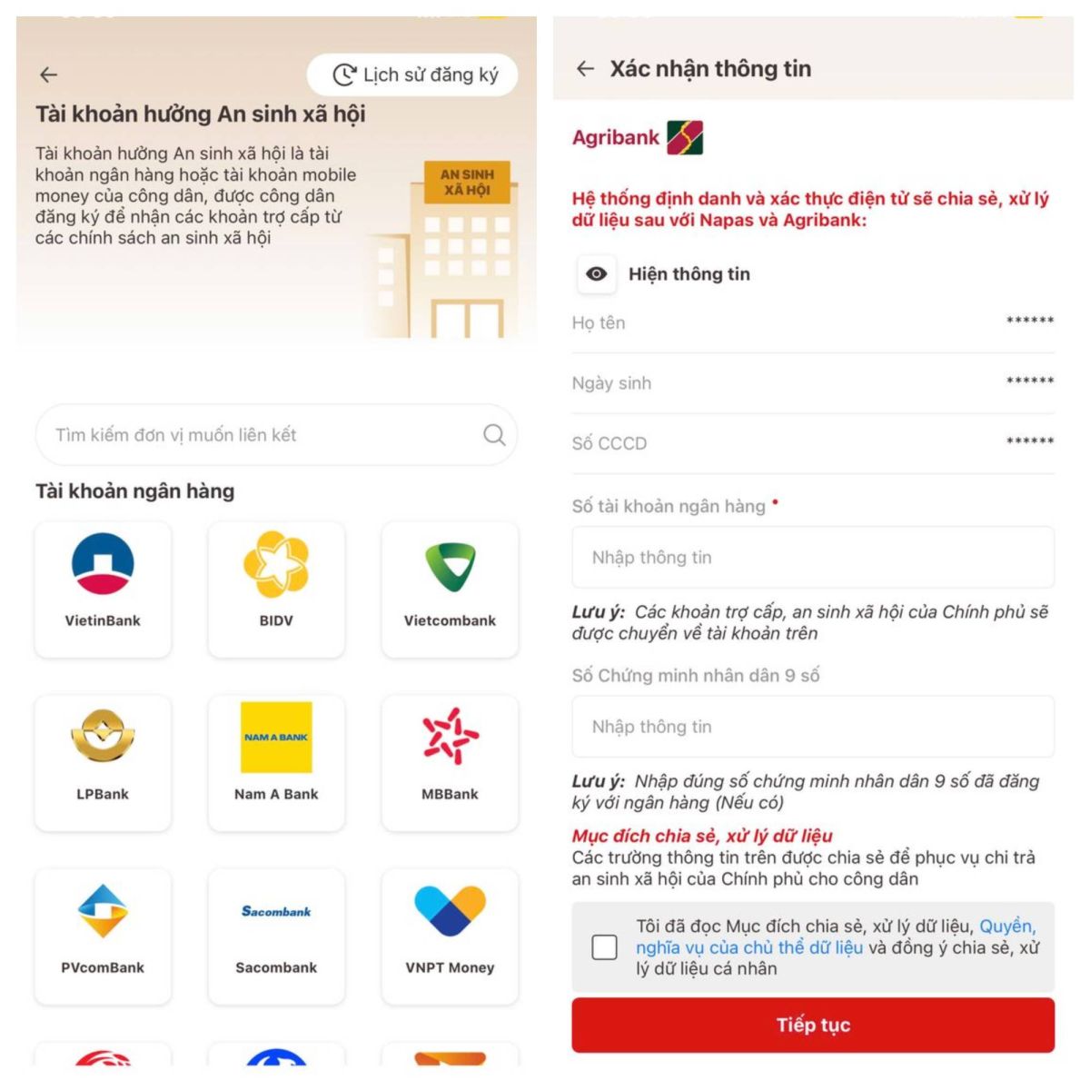 Điền đầy đủ thông tin cá nhân vào từng mục và tích chọn bên dưới phần thông tin "Tôi đã đọc Mục đích chia sẻ, xử lý dữ liệu, Quyền, nghĩa vụ của chủ thể dữ liệu và đồng ý chia sẻ, xử lý dữ liệu cá nhân" rồi chọn "Tiếp tục" để thực hiện việc gửi yêu cầu liên kết.