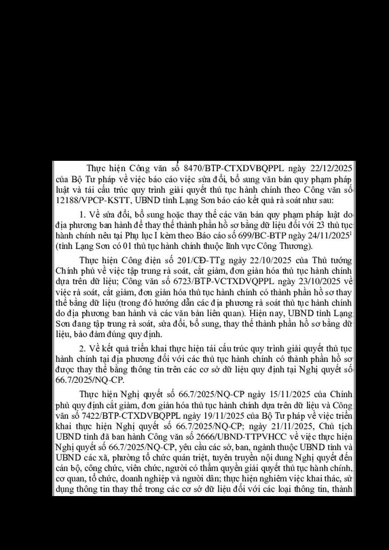 | Tiêu đề văn bản | V/v báo cáo theo yêu cầu của Bộ Tư pháp tại Công văn số 8470/BTP-CTXDVBQPPL ngày 22/12/2025 | ||
