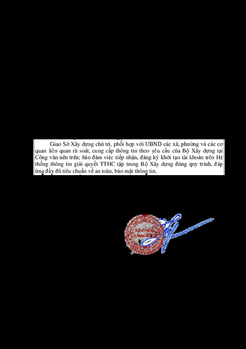| Tiêu đề văn bản | V/v rà soát, tổng hợp danh sách tài khoản cán bộ chưa được tạo trên Hệ thống thông tin giải quyết TTHC tập trung Bộ Xây dựng | ||