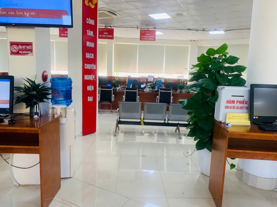 Tại khu vực tiếp công dân, bàn chờ, khu làm việc và hành lang đều được bố trí cây xanh, mang lại cảm giác gần gũi, tinh tế, chỉnh chu và hiện đại.