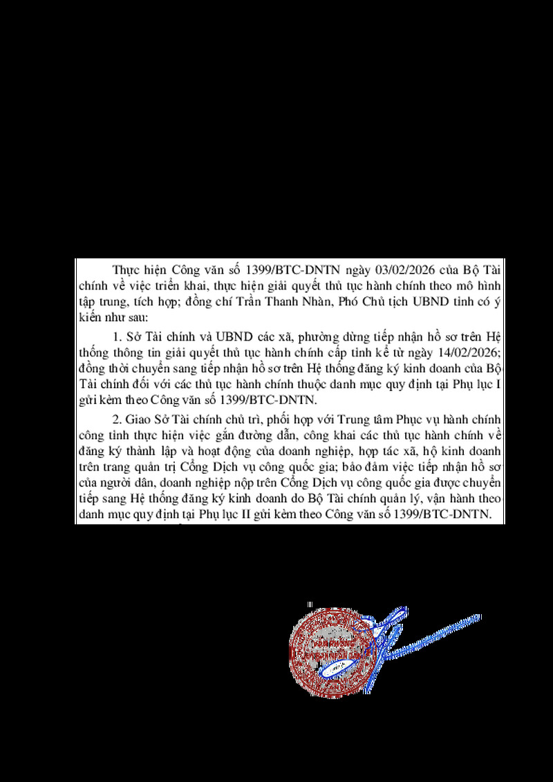 | Tiêu đề văn bản | V/v thực hiện Công văn số 1399/BTC-DNTN ngày 03/02/2026 của Bộ Tài chính | ||